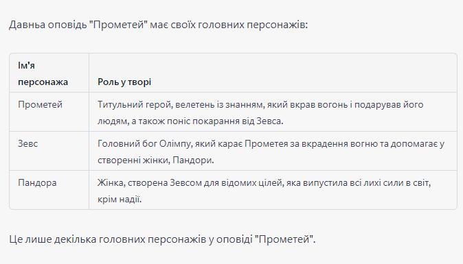 3. Заповни таблицю: упиши імена основних персонажів давньої оповіді «Прометей>> та роль, яку вони виконують у творі.