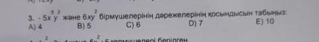 52 2 3. - 5х у және 6ху бiрмушелерiнiң дәрежелерiнiн қосындысын табыныз: A) 4 B) 5 C) 6 D) 7 E) 10 seipsou