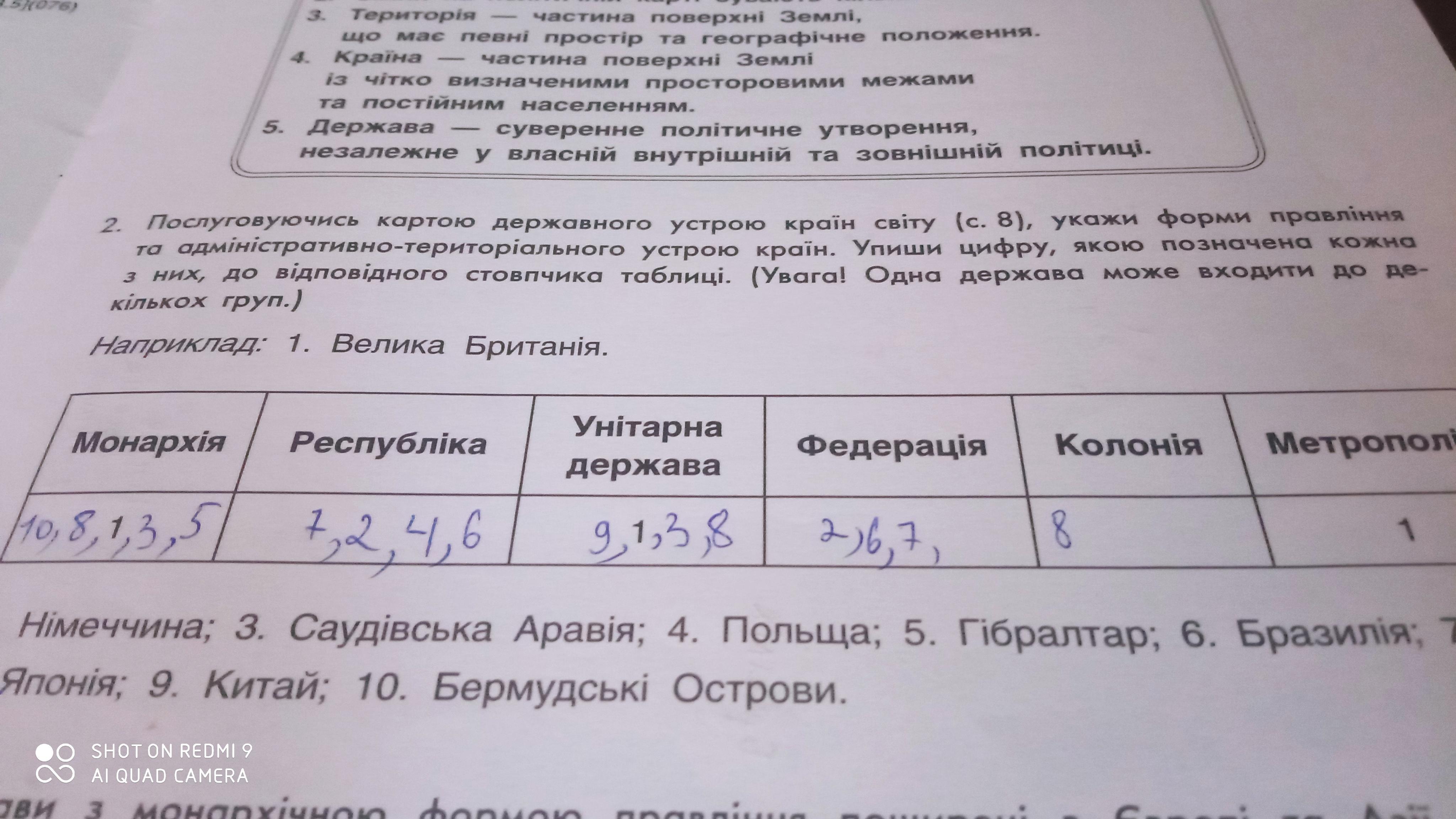Послуговуючись картою державного устрою країн світу (с. 8), укажи форми правління та адміністративно-територіального устрою країн. Упиши цифру, якою позначена кожна з них, до відповідного стовпчика таблиці. (Увага! Одна держава може входити до де- кількох груп.)