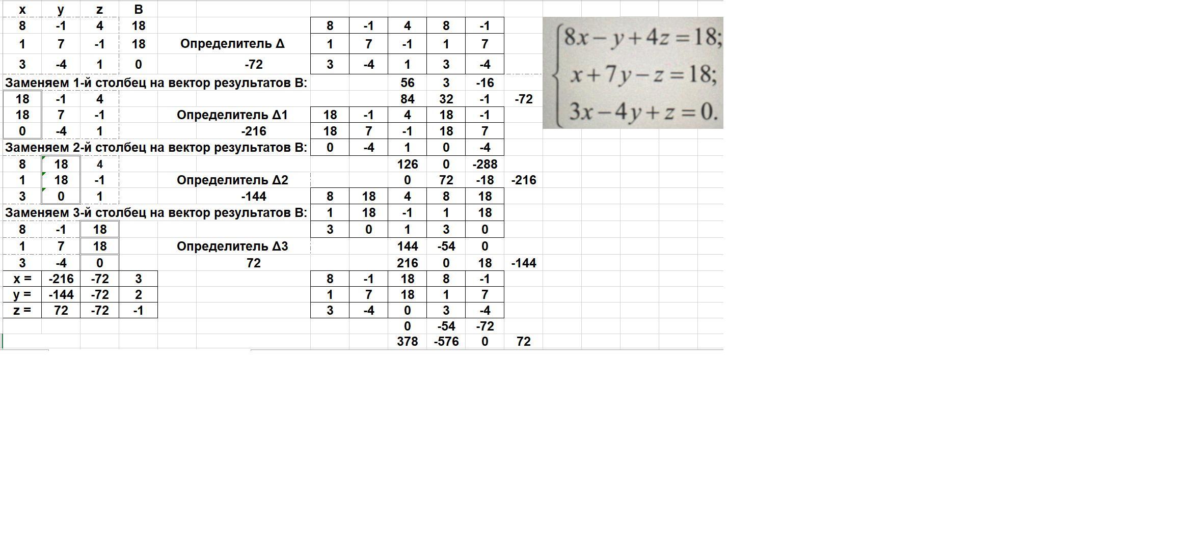 Применён метод Крамера с правилом Саррюса для нахождения определителей.