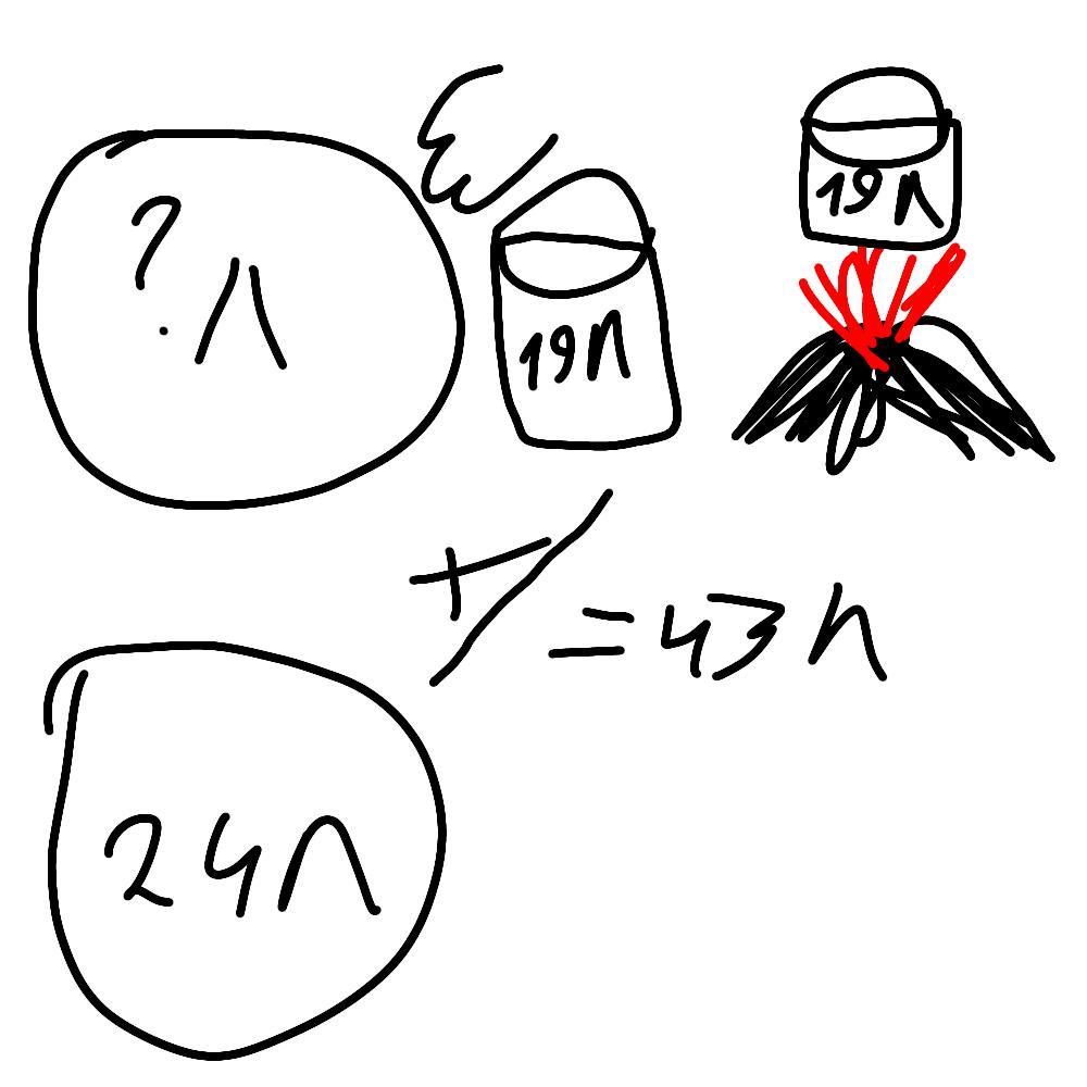 из ? сколько литров 19 литров достал, сжег на плите. Осталось 24, и до этого, там было ещё + 19. 24+19= 43 литра.