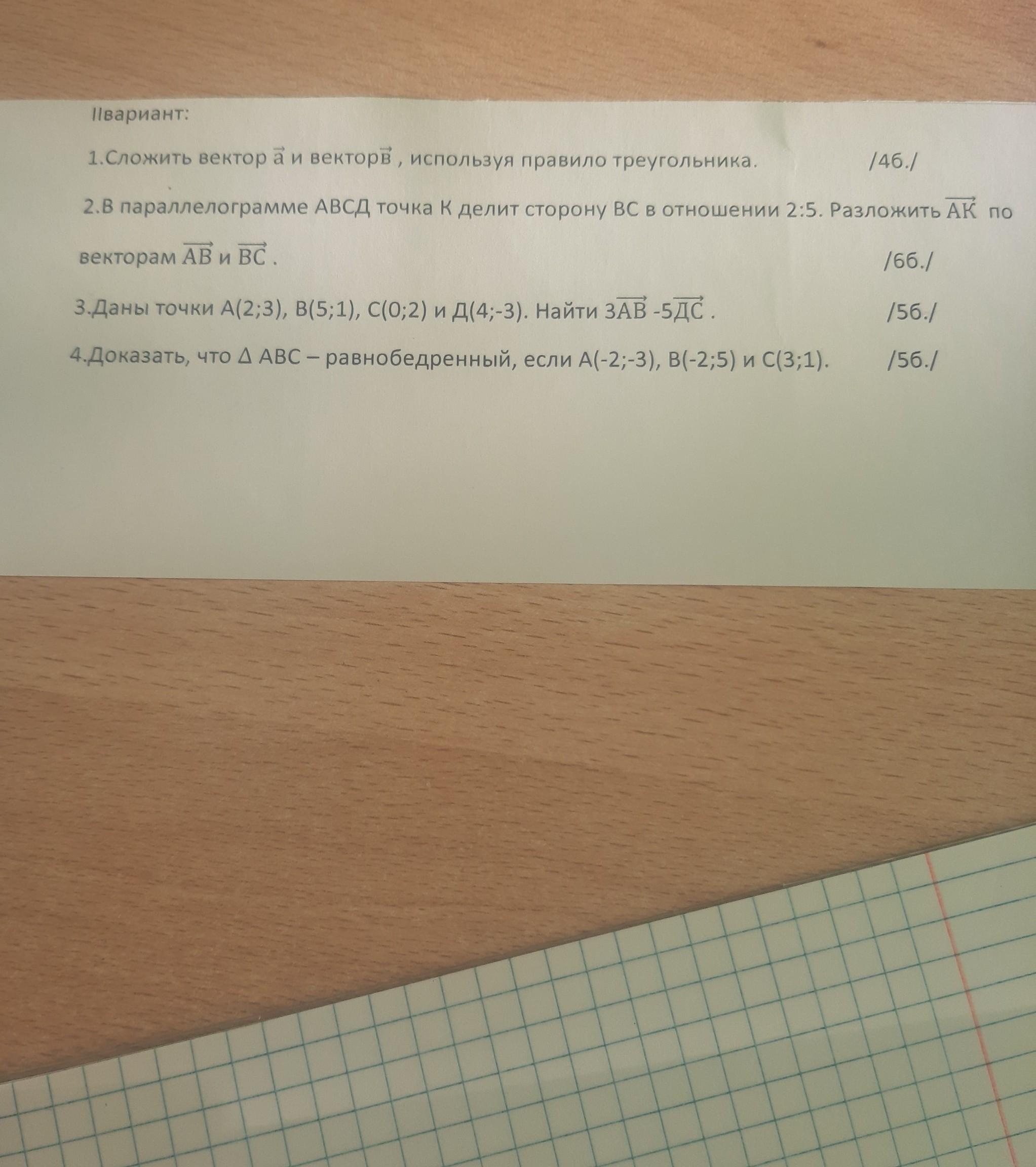 1.Сложить вектор а и векторв, используя правило треугольника. /46./ 2.В параллелограмме АВСД точка К делит сторону ВС в отношении 2:5. Разложить Ак п векторам АВ и BC . 3.Даны точки А(2;3), B(5;1), C(0;2) и Д(4;-3). Найти ЗАВ-5ДС. 4.Доказать, что ∆ ABC — равнобедренный, если A(-2;-3), B(-2;5) и С(3;1). /66./ /56./ /56./