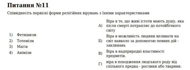 Питання №11 Співвіднесіть первісні форми релігійних вірувань з їхніми характеристиками