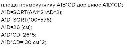 У прямокутному паралелепіпеді ABCDA B1C1D1 відомо, що AD = 24cM CD = 5CM AA1= 10 см. Чому дорівнює площа чотирикутника AB1CD