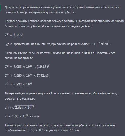 Рассчитайте время полета по полуэллиптической орбите до Урана, если среднее расстояние до Солнца равно 19,18 а.е.