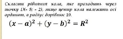 Скласти рiвняння кола, яке проходить через mочку D(- 8; - 2), якщо центр кола належить осі ордниот, а родіус дорівное 10. (x - a)2 + (y - b)2 = R2