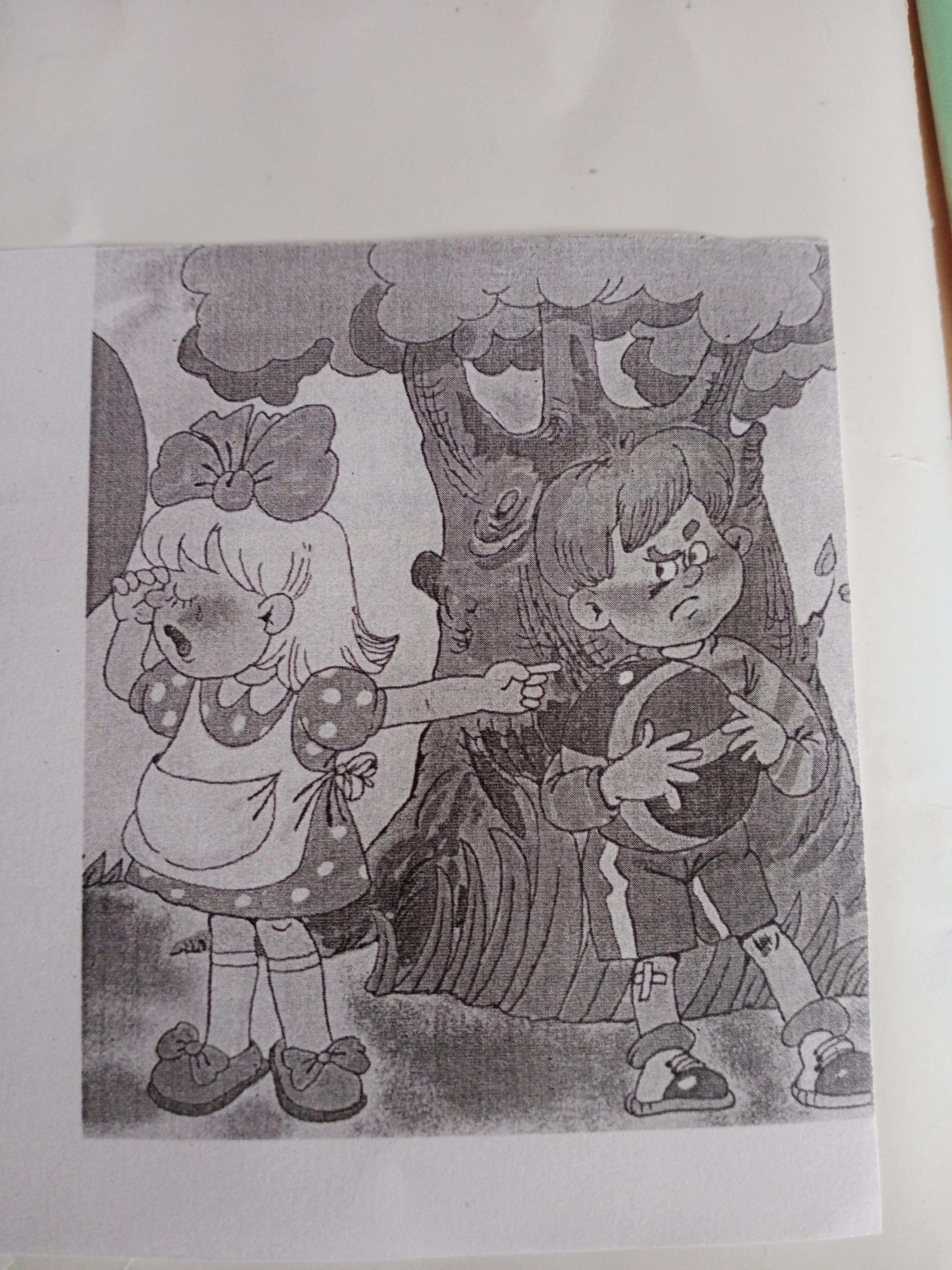 Бұл суретте бала қызды ренжітіп жатыр. Қыздың добын тартып алды. Ал қыз соған жылап жатыр. Менің ойымша біреуді ренжіту дұрыс емес. Біреудің көңілін ойлау керек. Ешкімді ренжетпеу керек