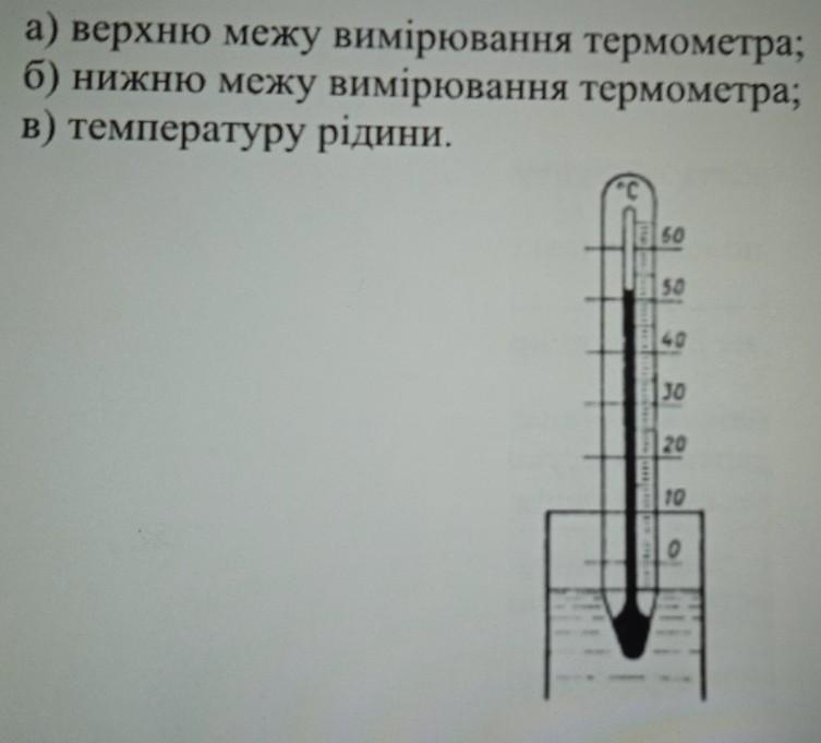 a) верхню межу вимірювання термометра; б) нижню межу вимірювання термометра; в) температуру рідини. 50 50 40 30 20 10