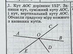 кут AOC дорівнює 152°. Запиши кут, суміжний кут AOC, і кут вертикальний кут AOC. Обчисли градусну міру кожного з названих кутів