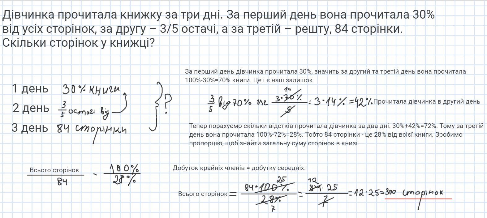 Дівчинка прочитала книжку за три дні. За перший день вона прочитала 30% від усіх сторінок, за другу – 3/5 остачі, а за третій – решту, 84 сторінки. Скільки сторінок у книжці?