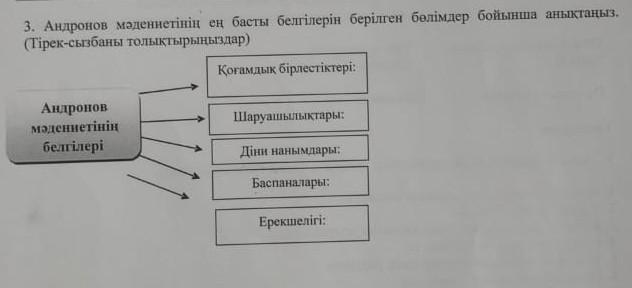 3. Андронов мәдениетінін ен басты белгілерін берілген белімдер бойынша анықтаңыз. (Тірек-сызбаны толыктырыныздар) Андронов мәдениетiнiн белгiлерi. Когамдык бiрлестiктерi:, Шаруашылықтары:, Дiни нанымдары:, Баспаналары:, Ерекшелігі: