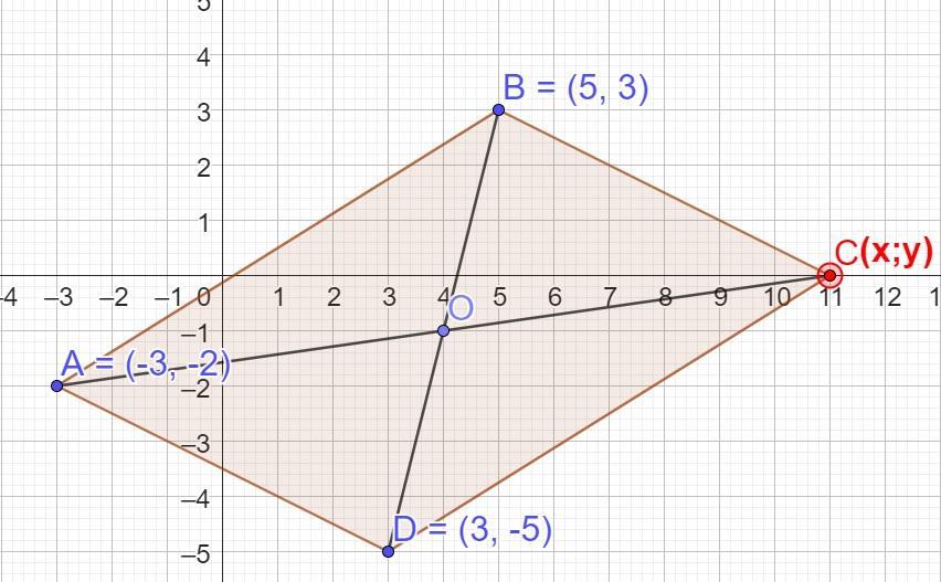 Отримали O(4; -1) - координати точки перетину діагоналей AC і BD.