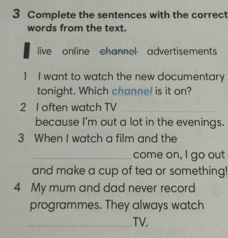 3 Complete the sentences with the correct words from the text. live online channel advertisements 1 I want to watch the new documentary tonight. Which channel is it on? 2 I often watch TV because I'm out a lot in the evenings. 3 When I watch a film and the come on, I go out and make a cup of tea or something! 4 My mum and dad never record programmes. They always watch TV.