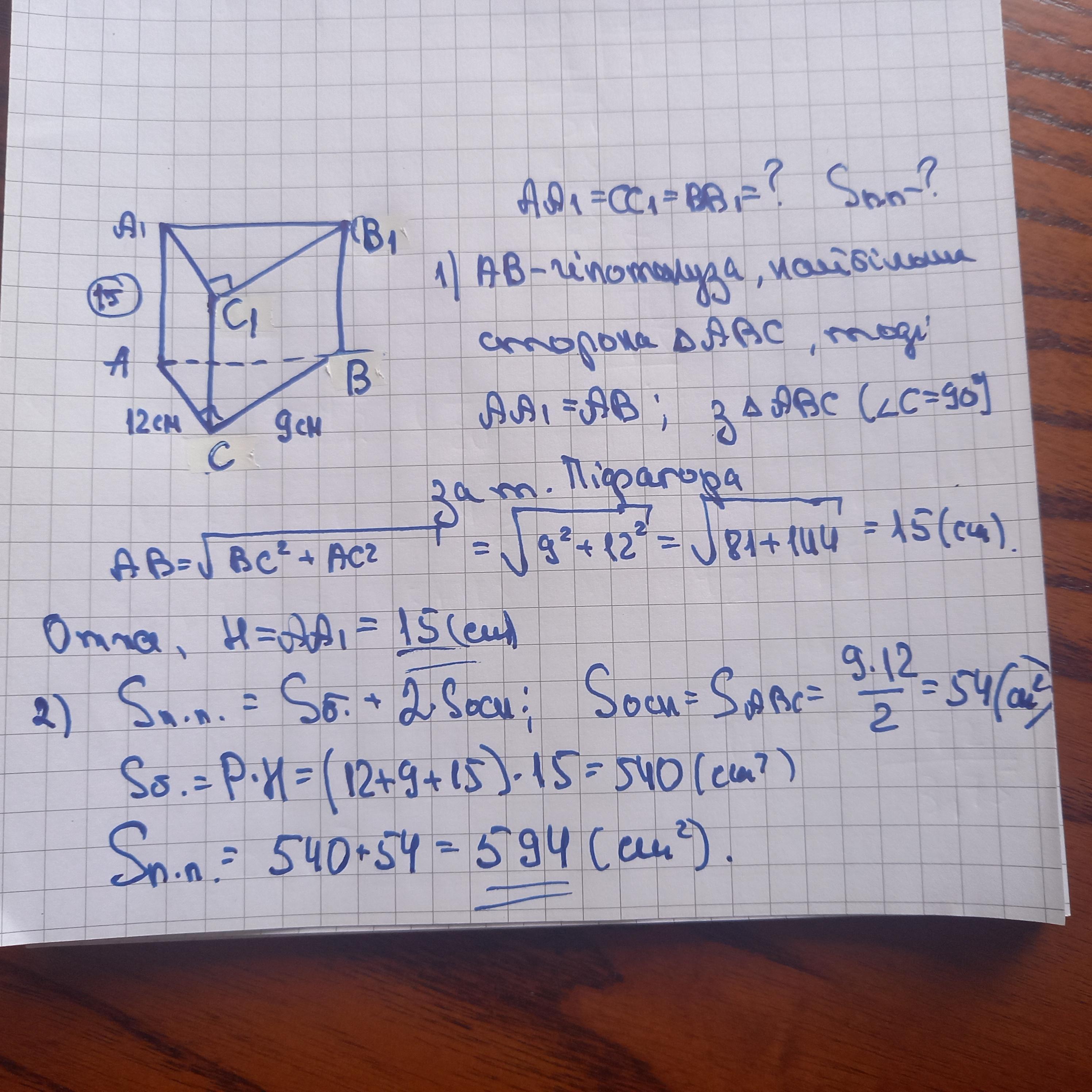 Основою прямої призми є прямокутний трикутник ABC (<C=90^ )^ - ? ВС=9 см, AC = 12 см. Висота призми дорівнює найбільшій стороні її основи.