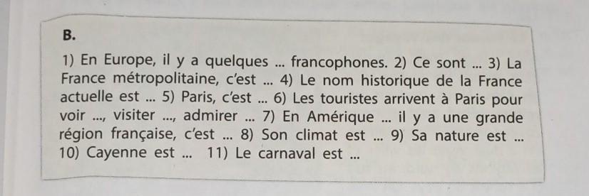 1) En Europe, il y a quelques ... francophones. 2) Ce sont ... 3) La France métropolitaine, c'est ... 4) Le nom historique de la France actuelle est ... 5) Paris, c'est ... 6) Les touristes arrivent à Paris pour voir visiter ..., admirer ... 7) En Amérique ... il y a une grande région française, c'est ... 8) Son climat est ... 9) Sa nature est ... 10) Cayenne est ... 11) Le carnaval est ... ...