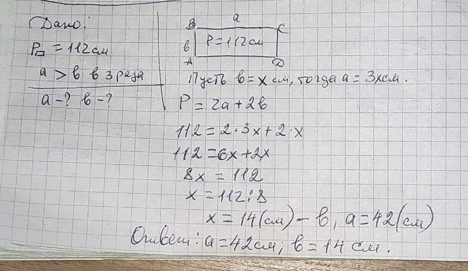 Периметр прямокутника дорівнює 112 см, а одна із його сторін утричі більша за другу. Знайдіть сторони прямокутника.
