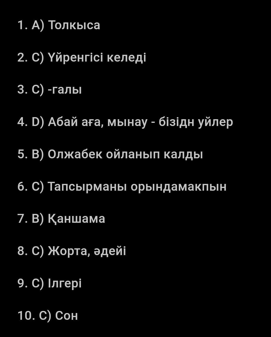 А) Келер едi В) Танысыпты С) Тапсырманы орындамакпын D) Баргым келеді Е) Адал еңбек ету