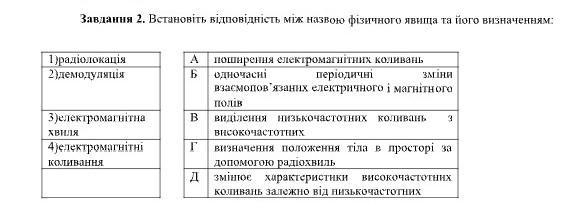 Завдання 2. Встановіть вiдповiднiсть мiж назвою фізичного явища та його визначенням: 1)радіолокацiя 2 демодуляцiя A поширення електромагнітних коливань Б одночасн періодичні 3)електромагнітна ХВИЛЯ 4) електромагнітні коливання змiни взаємопов'язаних електричного і магнітного полiв B виділення низькочастотних коливань 3 Д високочастотних r визначення положення тіла в просторі за допомогою радіохвиль змішое характеристики високочастотних коливань залежно вiд низькочастотних