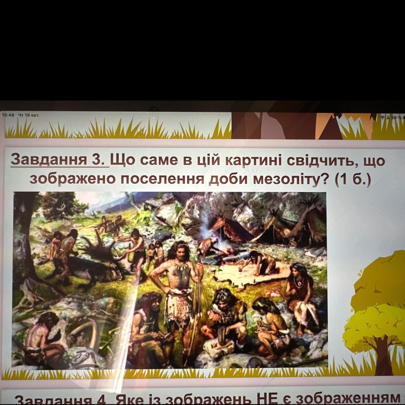 Мезолі́т, Середньокам'яна доба — епоха кам'яної доби, що була перехідною між палеолітом і неолітом. На картині зображено саме використання кам'яних знарядь праці, своєрідний розквіт і прогрес в еволюції людства. Саме в цей час удосконалився побут людини, з’являлися нові знаряддя праці, змінювався спосіб життя. Люди стали збиратися в більші племена, звані родової громадою. Це допомагало більш успішно відбиватися від ворогів і добувати їжу.