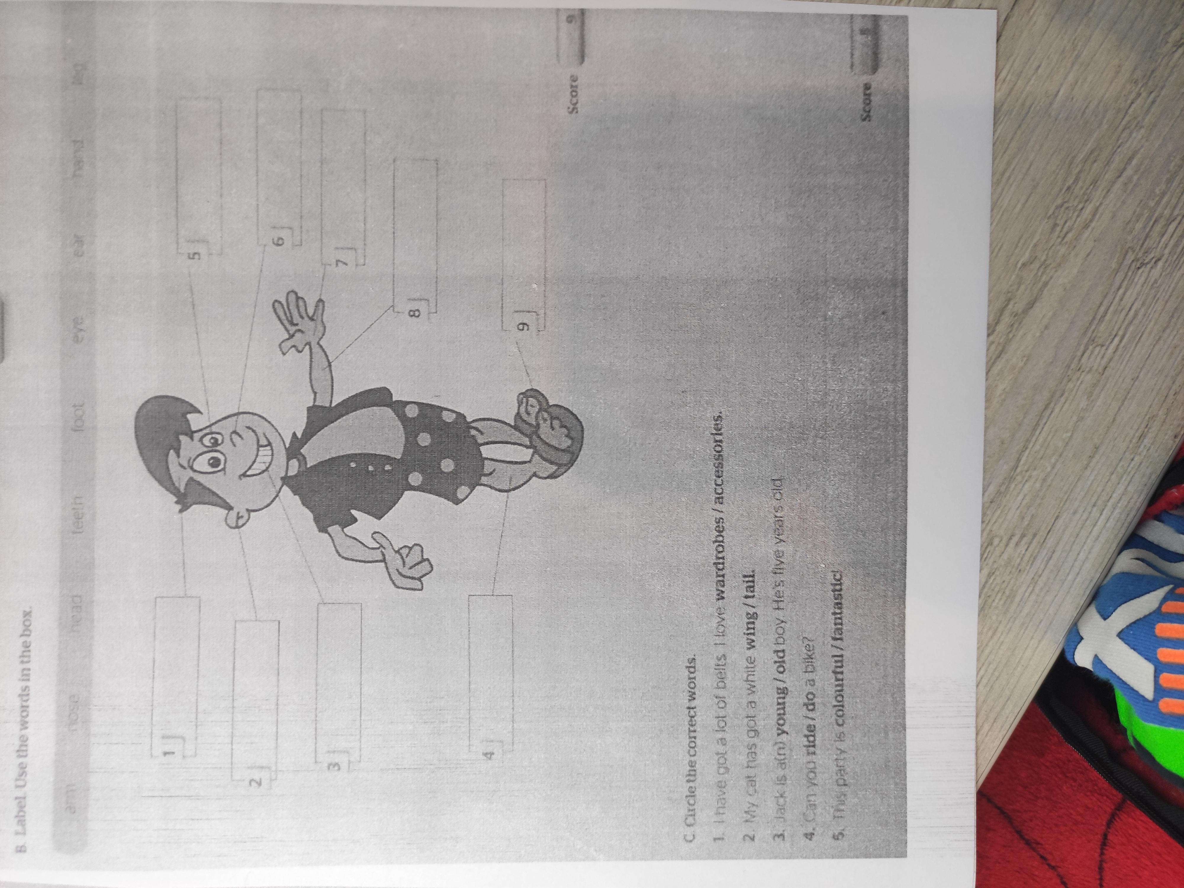 1)- head 2)-ear 3)- teeth 4)- leg 5)- eye 6)- nous 7)- hand 8)- arm 9)- foot