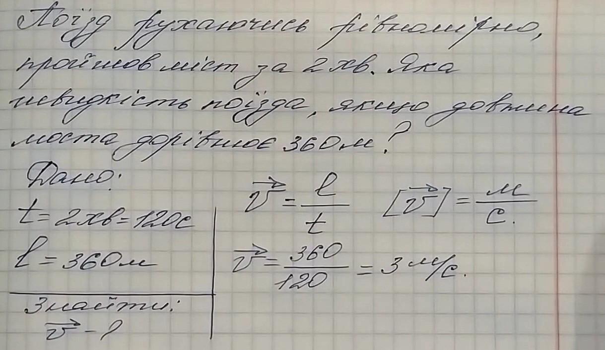 2. Поїзд рухаючись рівномірно, пройшов міст за 2 хв. Яка швидкість поїзда, якщо довжина моста дорівнює 360 м?