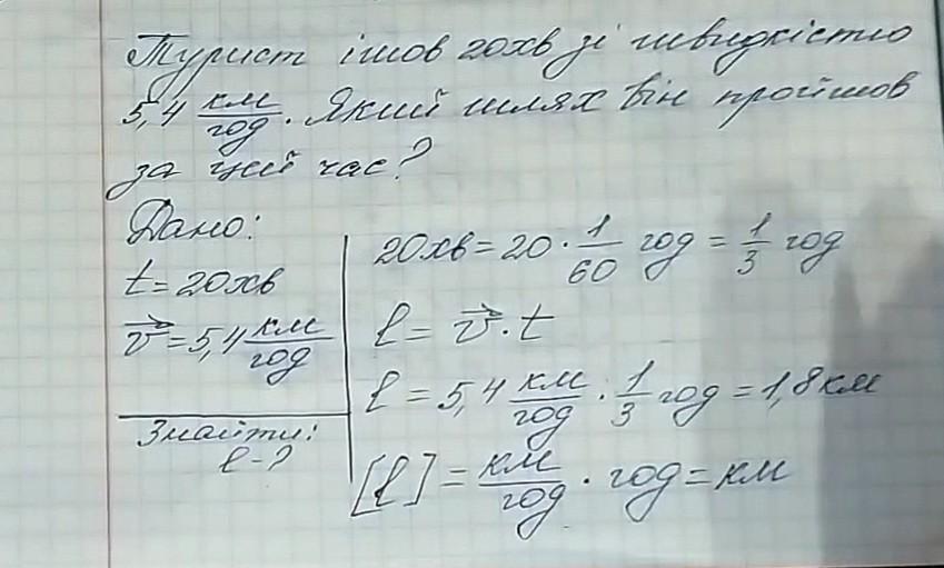 1.Турист ішов 20 хв зі швидкістю 5,4 км\год . Який шлях він пройшов за цей час?