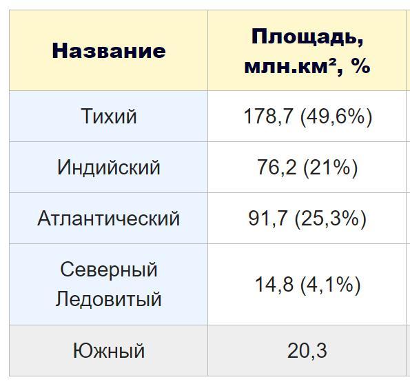 - Изучите таблицу, сделайте вывод о площади океанов.
