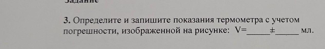 задание 3. Определите погрешности, изображенной на рисунке: V= + и запишите показания термометра с учетом мл.