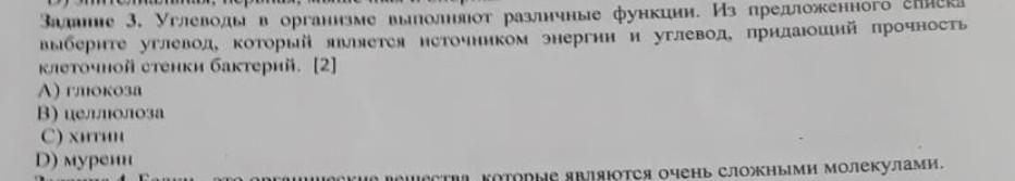 Задание 3. Углеводы в организме выполняют различные функции. Из предложенного списка выберите углевод, который является источником энергии и углевод, придающий прочность клеточной стенки бактерий. [2]