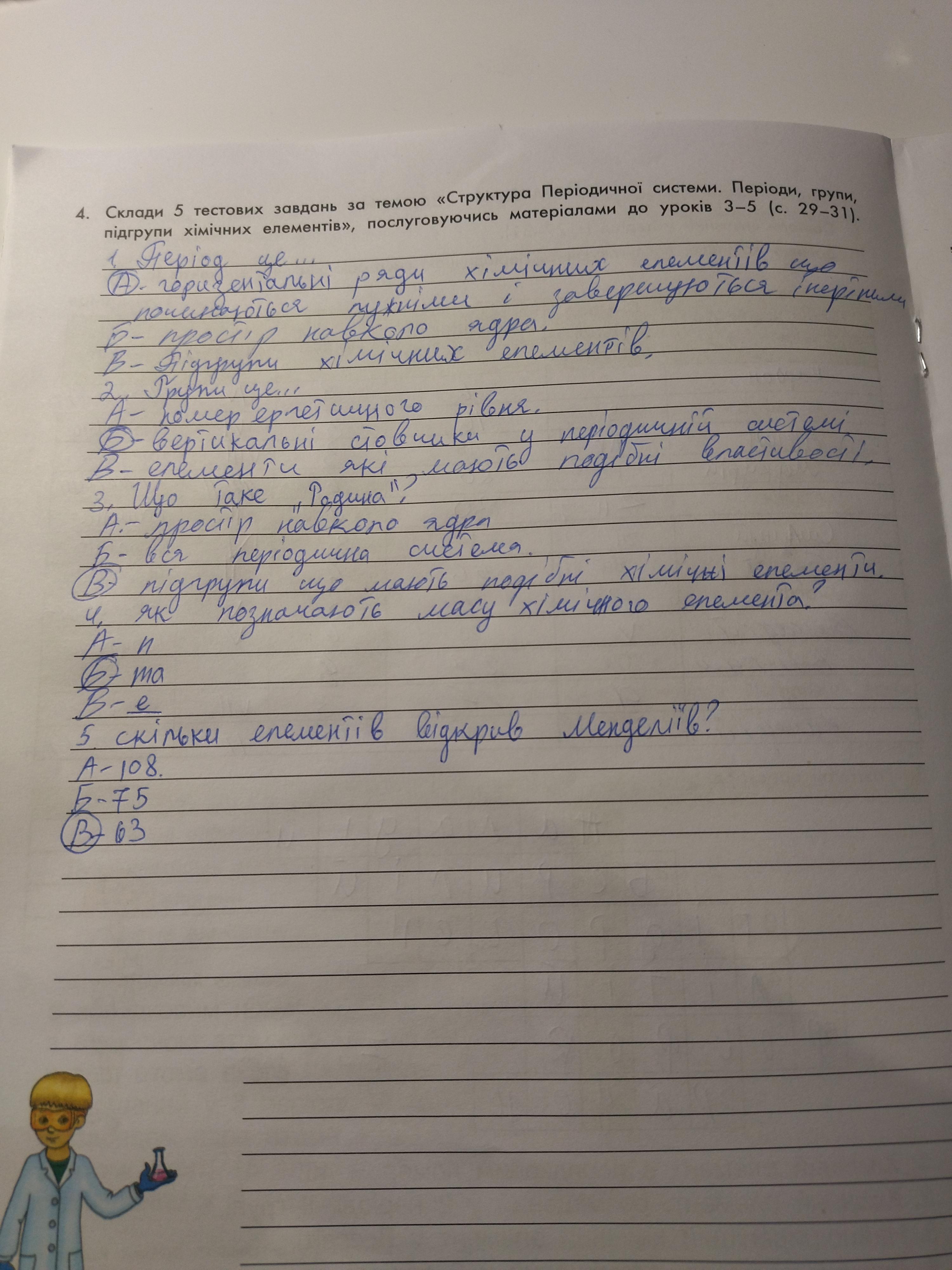 4. Склади 5 тестових завдань за темою «Структура, Періодичної системи. Періоди, групи, підгрупи хімічних елементів», послуговуючись матеріалами до уроків 3-5 (с. 29-31)