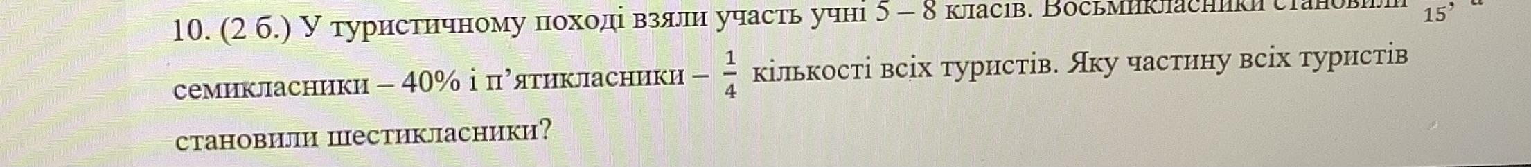 4/15 + 2/5 + 1/4 = 16/60 + 24/60 + 15/60 =55/60 = 11/12часть это восьмиклассники , семиклассники и пятиклассники