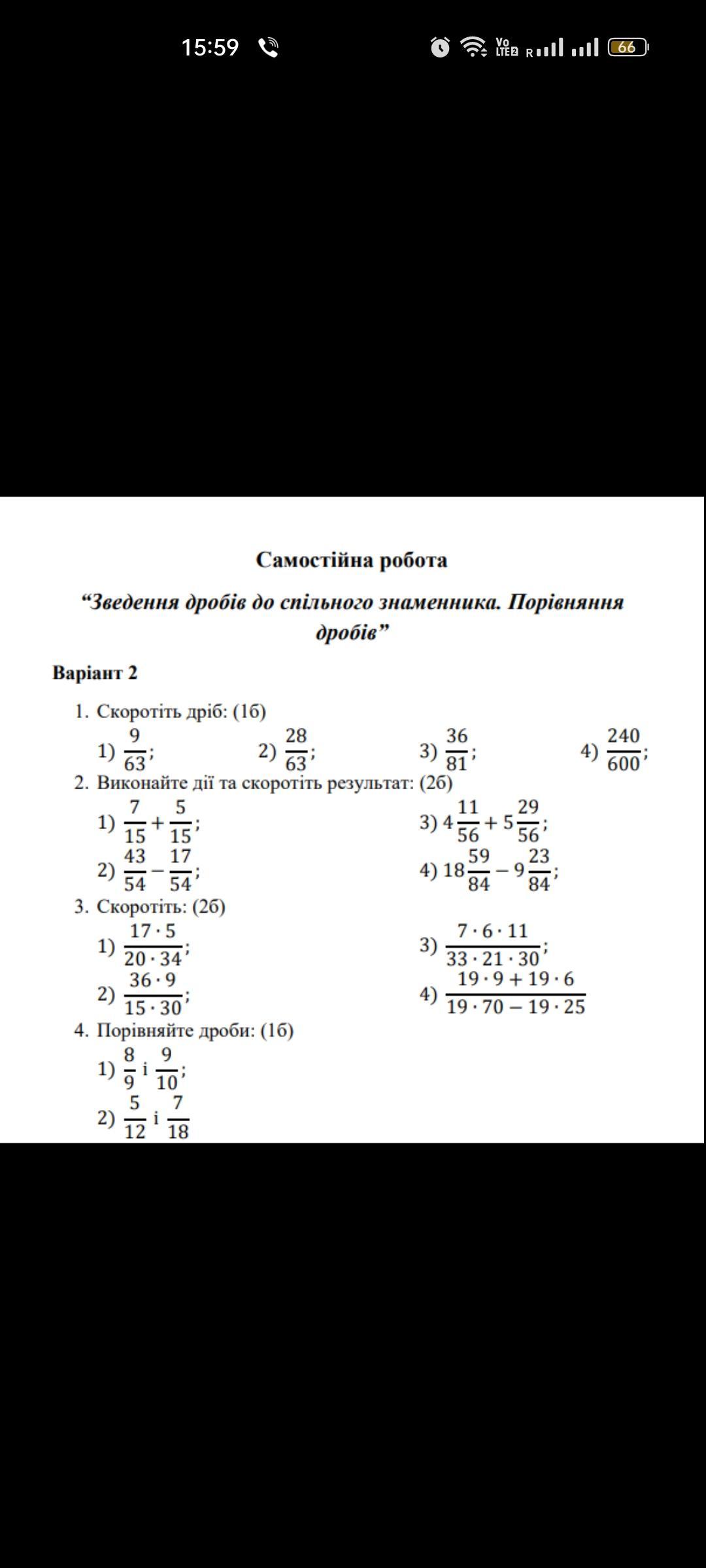 Будь ласка допоможіть дам 16 балів можете зробити тільки перше завдання Скоротіть дріб 1) 9/63 2)28/63 3)36/81 4)240/600