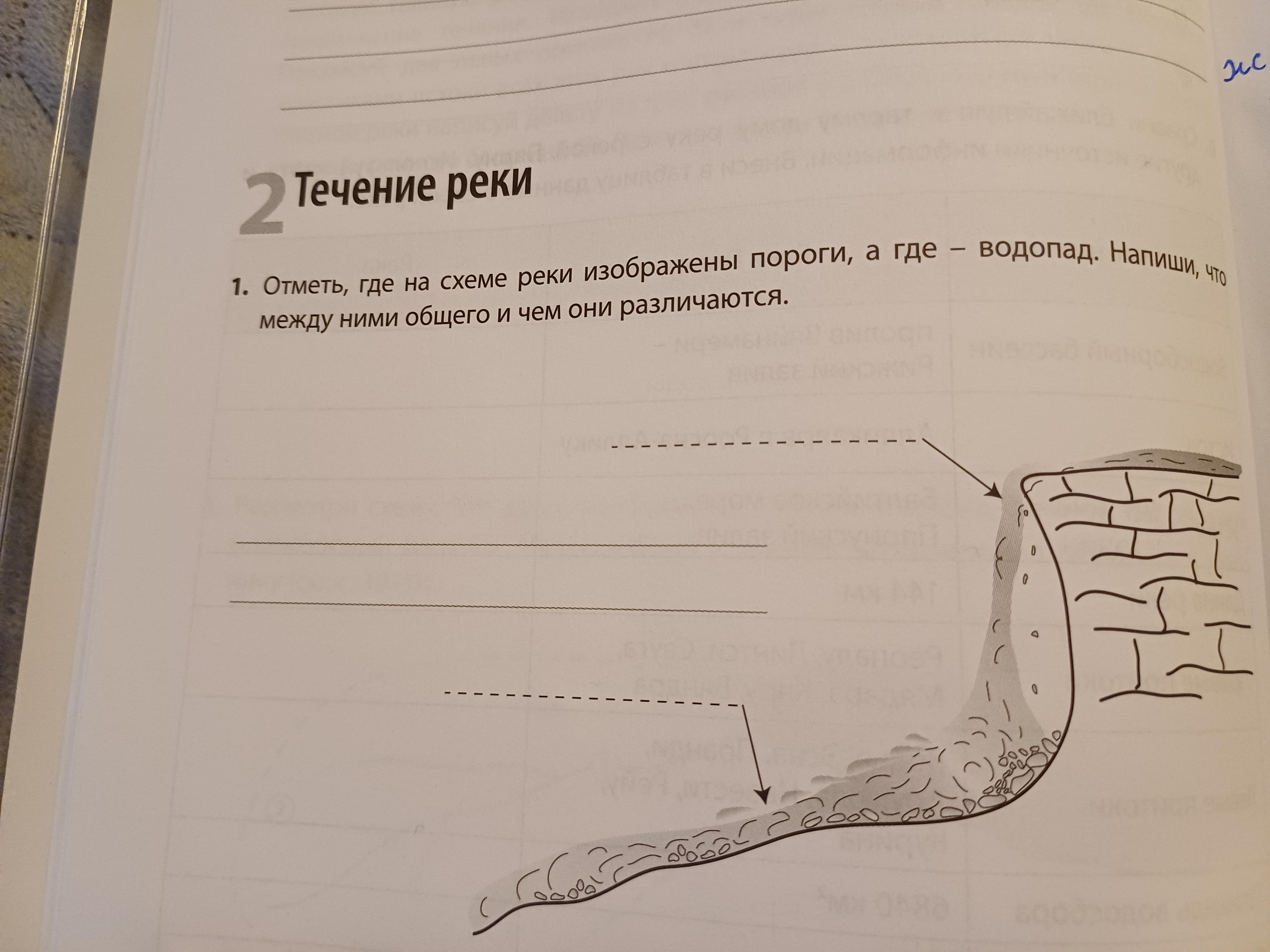 Отметь, где на схеме реки изображены пороги, а где - водопад. Напиши, что между ними общего и чем они различаются.