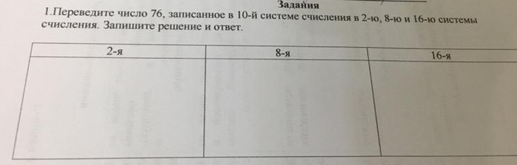 1. Переведите число 76, записанное в 10-й системе счисления в 2-ю, 8-ю и 16-ю системы счисления. Запишите решение и ответ