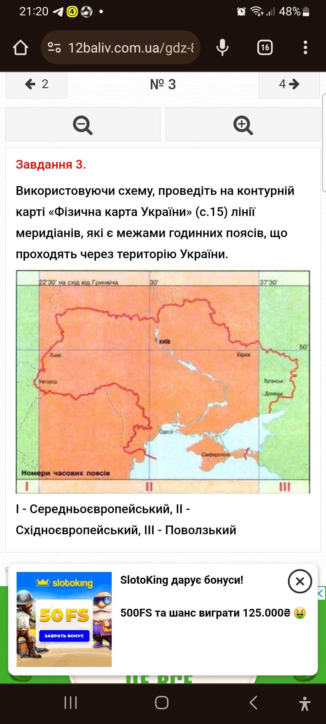лінії меридіанів, які є межами годинних поясів, що проходять через територію України.