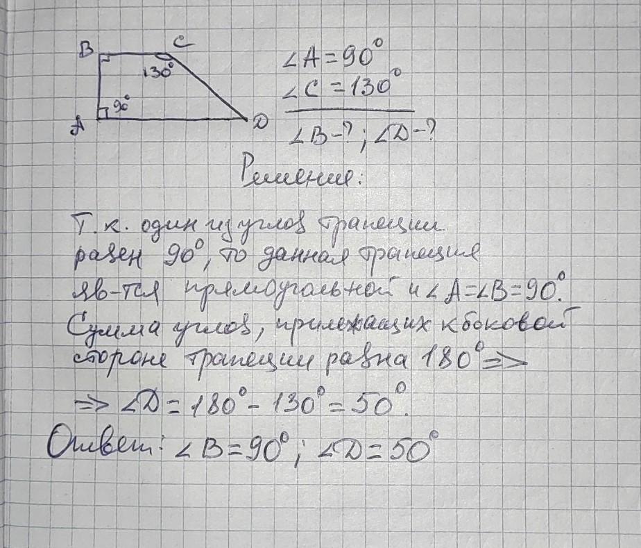 Величини двох протилежних кутів трапеції дорівнюють 90і130 градусів .Знайдіть інші кути трапеції