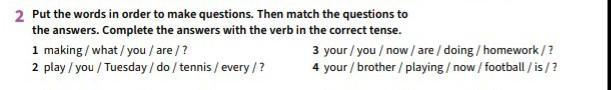 Put the words in order to make questions. Then match the questions to the answers. Complete the answers with the verb in the correct tense. 1 making/what/you/are/? 3 your/you/now/are/ doing/homework/? 2 play/you/Tuesday/do/tennis/every/? 4 your/brother/playing/now/football/is/?