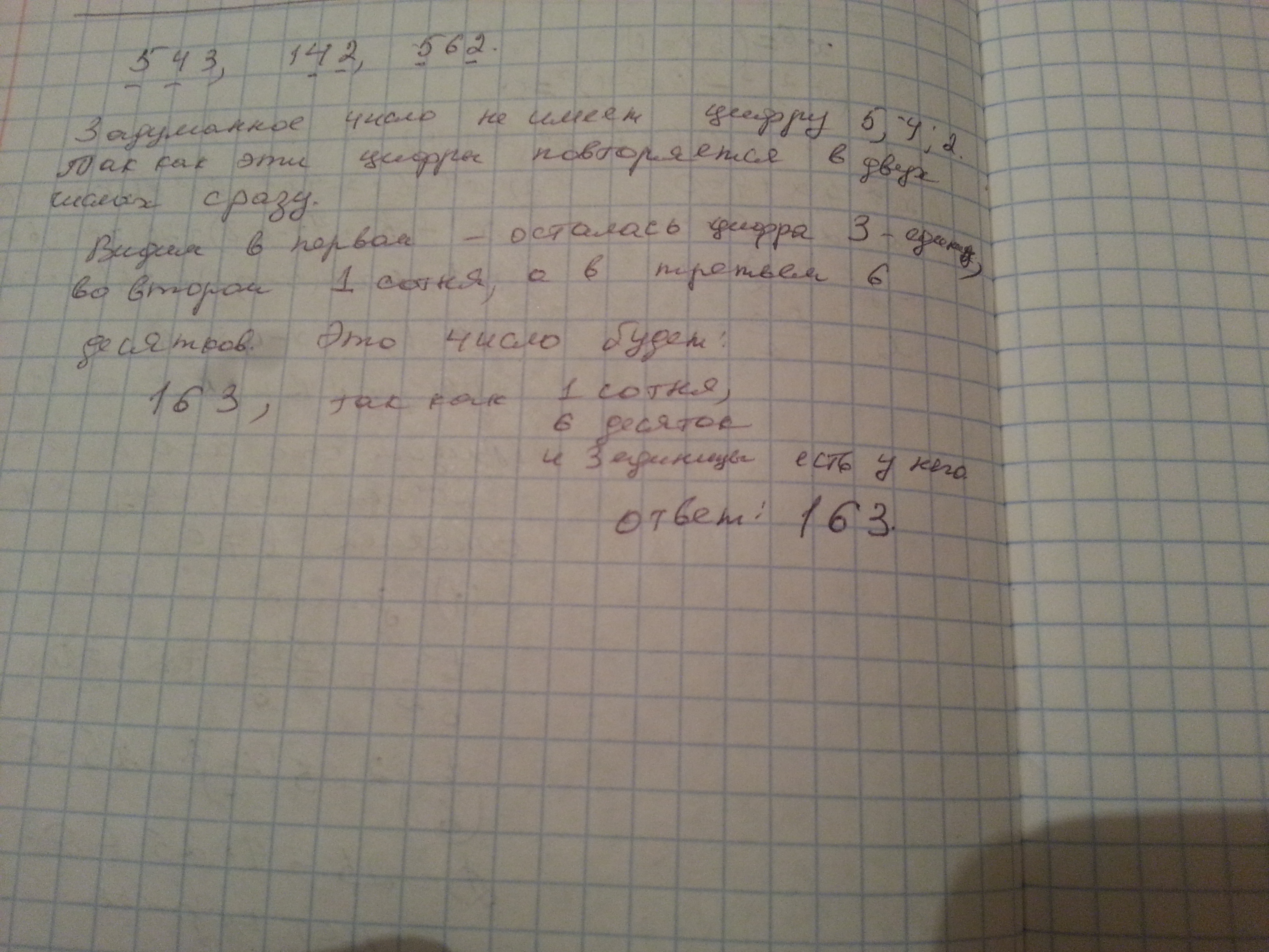 Задумано трёхзначное число, у которого с любым из трёх чисел 543, 142, 562 совпадает один из трёх разрядов, а два других не совпадают. Какое число задумано? варианты ответов 145, 163, 243, 462.