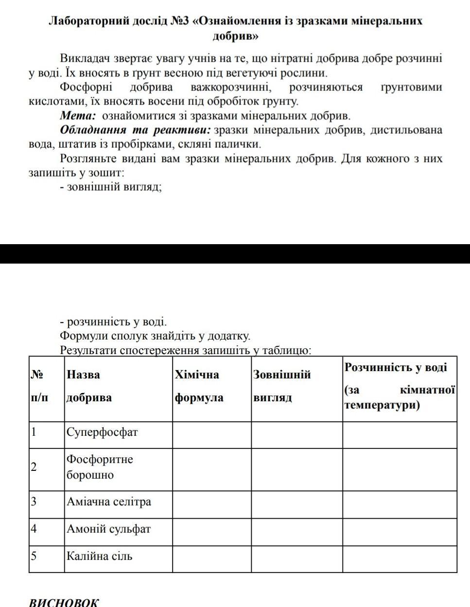 Викладач звертає увагу учнів на те, що нітратні добрива добре розчинні у воді. Їх вносять в грунт весною під вегетуючі рослини. добрива розчиняються грунтовими Фосфорні важкорозчинні, кислотами, їх вносять восени під обробіток ґрунту. Мета: ознайомитися зі зразками мінеральних добрив. Обладнання та реактиви: зразки мінеральних добрив, дистильована вода, в iз пробірками, скляні палички. Розгляньте видані вам зразки мінеральних добрив. Для кожного з них запишіть у зошит: - зовнішній вигляд; No п/п 1 2 Лабораторний дослід №3 «Ознайомлення із зразками мінеральних добрив» 3 4 5 - розчинність у воді. Формули сполук знайдіть у додатку. Результати спостереження запишіть у таблицю: |Назва Зовнішній добрива Суперфосфат |Фосфоритне борошно Аміачна селітра |Амоній сульфат Калiйна сіль ВИСНОВОК Хімічна формула ВИГЛЯД Розчинність у воді кімнатної (за |температури)