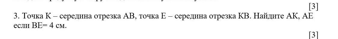[3] 3. Точка К-середина отрезка АВ, точка Е- середина отрезка КВ. Найдите АК, АЕ если ВЕ= 4 см. [3]