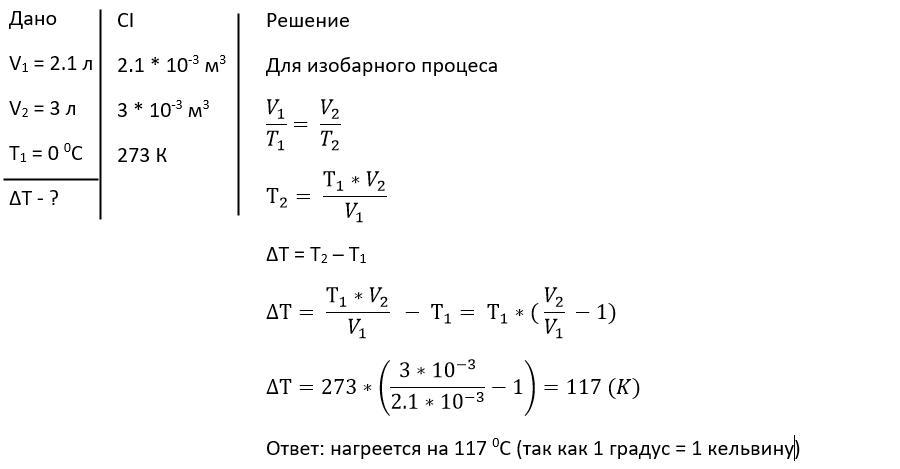 Газ занимает объём 2, 1 л при температуре 0 С. На сколько градусов нагреется газ при изобарном расширении до объёма 3 л?
