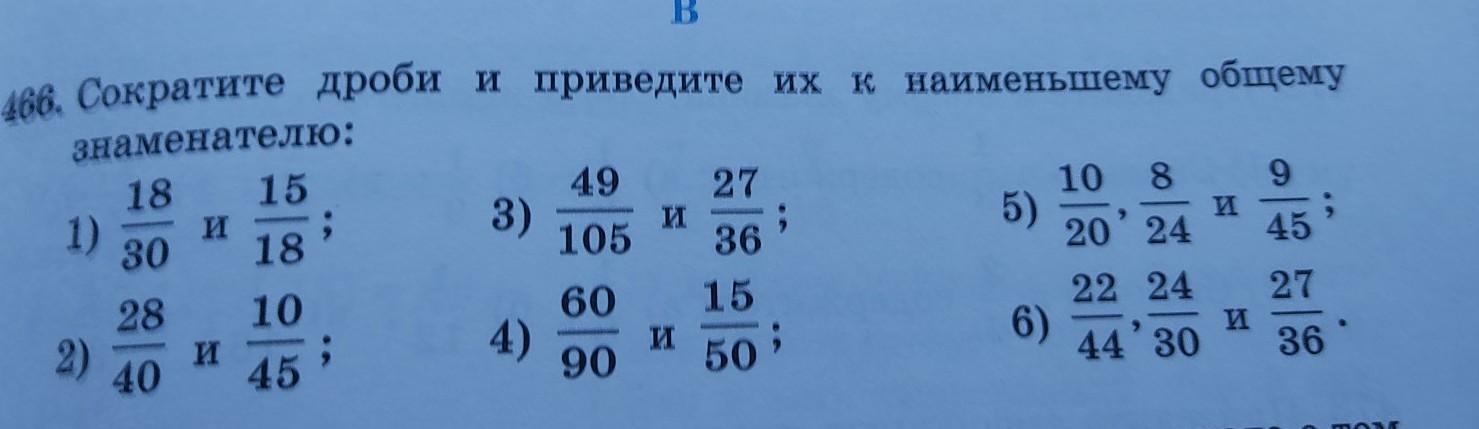 466. Сократите дроби и приведите их к наименьшему общему знаменателю: 1) 2) 18 /15 и 30 /18 28 /10 40/ 45 И 3) 4) 49 105 60 90 и и 27 36 15 50 ; 5) 6) 10 8 20 24 22 24 44 30 9 и и 9 45 27 36 срочно надо