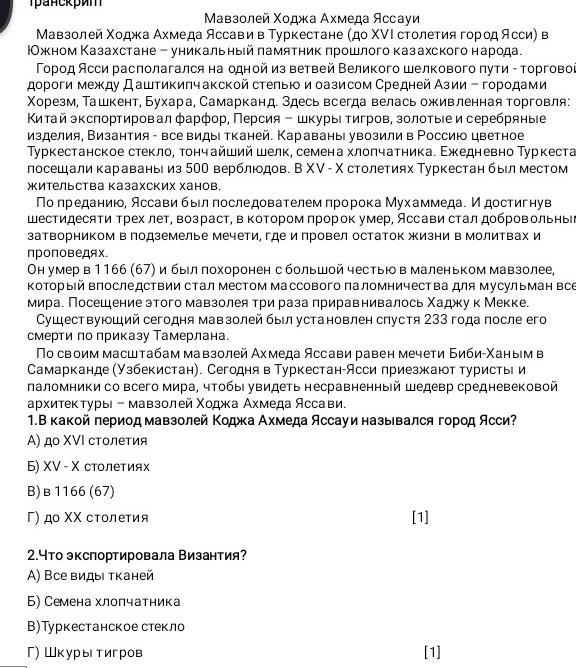 Мавзолей Ходжа Ахмеда Яссауи Мавзолей Ходжа Ахмеда Яссави в Туркестане (до XVI столетия город Ясси) в Южном Казахстане - уникальный памятник прошлого казахского народа. Город Ясси располагался на одной из ветвей Великого шелкового пути-торговой дороги между Даштикипчакской степью и оазисом Средней Азии - городами Хорезм, Ташкент, Бухара, Самарканд. Здесь всегда велась оживленная торговля: Китай экспортировал фарфор, Персия - шкуры тигров, золотые и серебряные изделия, Византия - все виды тканей. Караваны увозили в Россию цветное Туркестанское стекло, тончайший шелк, семена хлопчатника. Ежедневно Туркестан посещали караваны из 500 верблюдов. В XV-X столетиях Туркестан был местом жительства казахских ханов. По преданию, Яссави был последователем пророка Мухаммеда. И достигнув шестидесяти трех лет, возраст, в котором пророк умер, Яссави стал добровольным затворником в подземелье мечети, где и провел остаток жизни в молитвах и проповедях. Он умер в 1166 (67) и был похоронен с большой честью в маленьком мавзолее, который впоследствии стал местом массового паломничества для мусульман всего мира. Посещение этого мавзолея три раза приравнивалось Хаджу к Мекке. Существующий сегодня мавзолей был установлен спустя 233 года после его смерти по приказу Тамерлана. По своим масштабам мавзолей Ахмеда Яссави равен мечети Биби-Ханым в Самарканде (Узбекистан). Сегодня в Туркестан-Ясси приезжают туристы и паломники со всего мира, чтобы увидеть несравненный шедевр средневековой архитектуры - мавзолей Ходжа Ахмеда Яссави. 1.В какой период мавзолей Коджа Ахмеда Яссауи назывался город Ясси? А) до ХVI столетия Б) ХV-Х столетиях в) в 1166 (67) Г) до ХХ столетия 2.Что экспортировала Византия? А) Все виды тканей Б) Семена хлопчатника В)Туркестанское стекло г) Шкуры тигров