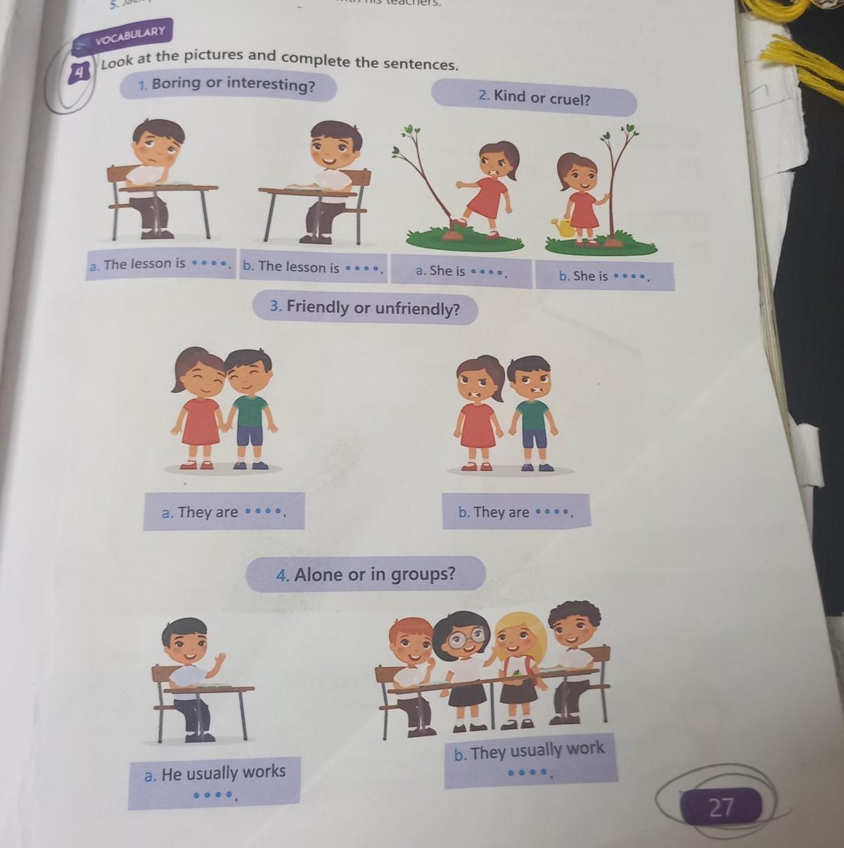 VOCABULARY 4 Look at the pictures and complete the sentences. 1. Boring or interesting? T a. The lesson is..... b. The lesson is 2. Kind or cruel? a. She is ..... 3. Friendly or unfriendly? b. She is... пжжжжжжжжж дам 100 баллов