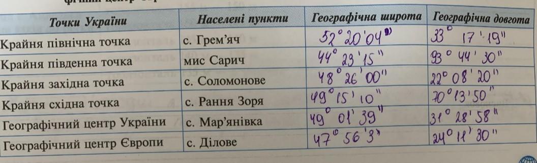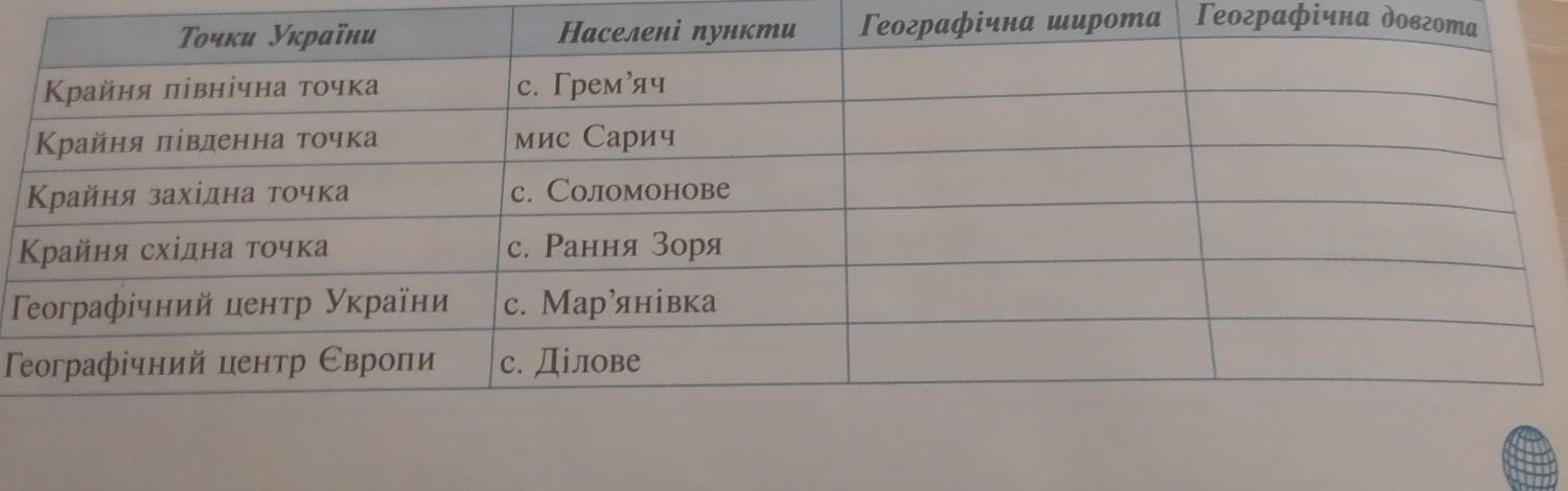 Завдання 2. На контурній карті (с. 8) нанесіть крайні точки України, її географічний центр та геогра- фічний центр Європи. Заповніть таблицю.