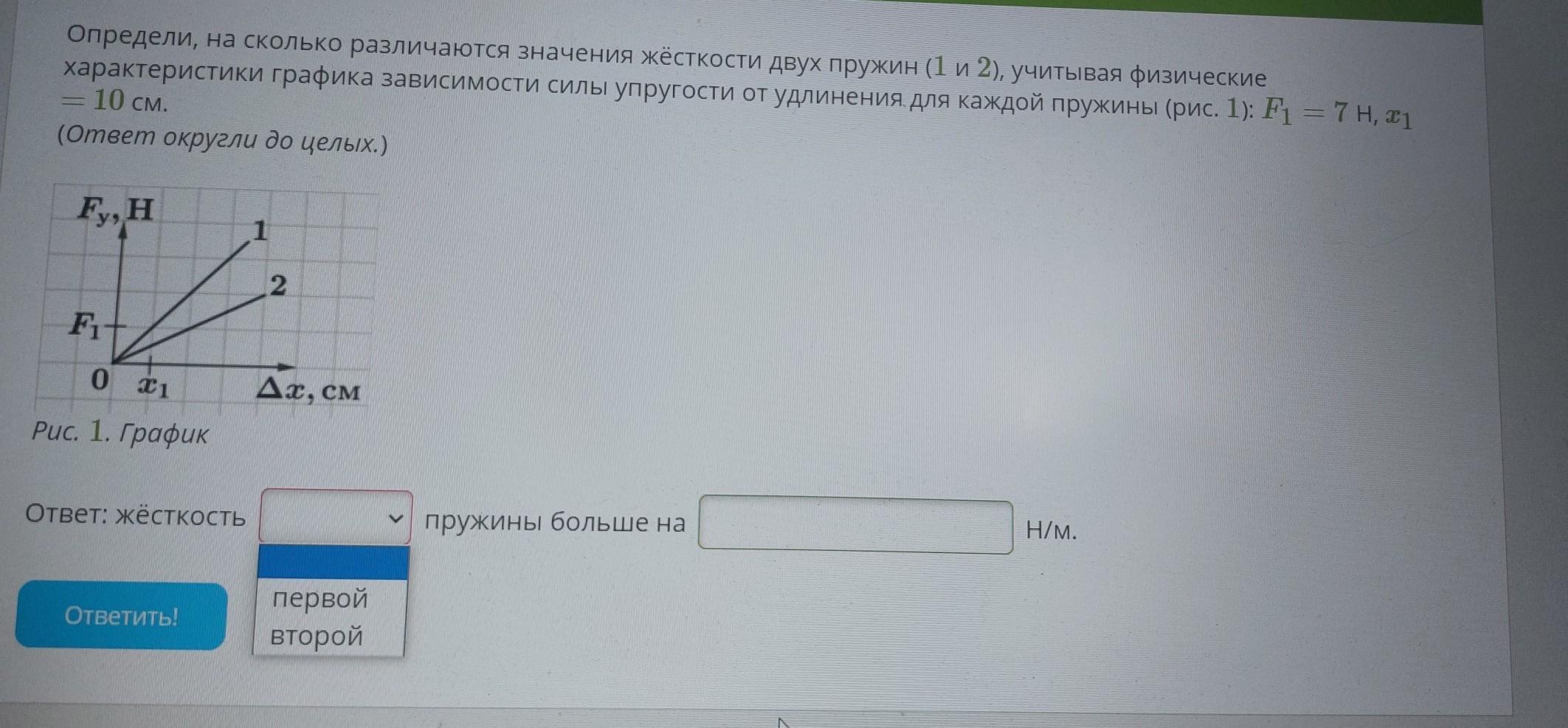 условие задания: Определи, на сколько различаются значения жёсткости двух пружин (1 и 2), учитывая физические характеристики графика зависимости силы упругости от удлинения. Для каждой пружины (рис. 1): F1 = 7 H, x1 - 10 см. (Ответ округли до целых.) Fy, H F1 0 X1 Рис. 1. График Ответ: жёсткость Ответить! 2 Ax, см первой второй пружины больше на R 2 Б Н/м.