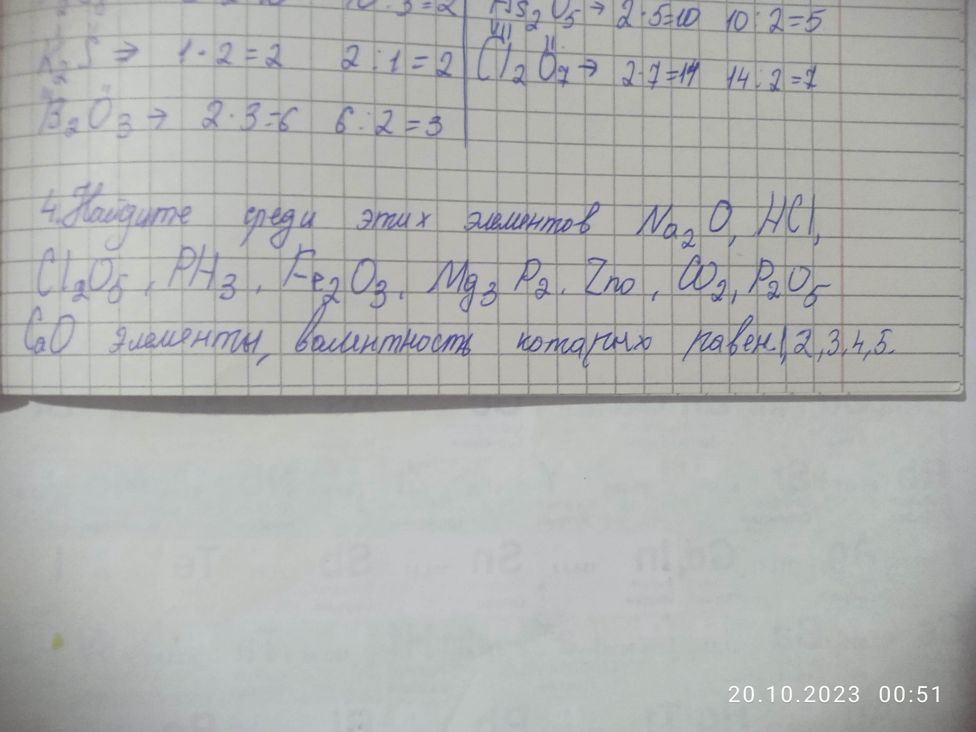Найдите среди этих элементов Na2O, HCI , CI2O5 , PH3, Fe2O3 Mg2P2 , ZnO , CO2 , P2O5, CaO элементы, валентность которые равны единице, двум, трем четыре и пять