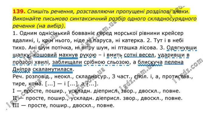 139 Спишіть речення, розставляючи пропущені розділові знаки. Виконайте пись- мово синтаксичний розбір одного складносурядного речення (на вибір). 1. Одним однісінький бовваніє серед морської рівнини крейсер вдалині і крім нього ніде ні паруса ні катерка (Олесь Гончар). 2. Тут і в небі тихо. Ані шум потічка ні вітру шум ні пташка лісова (Л. Костенко). 3. Одяг- нувши шапку кошовий махнув рукою і вмить сотні весел ударивши в прозорі хвилі заблищали срібною сльозою а блискуча пелена Дніпра ска- ламутилася (А. Кащенко).
