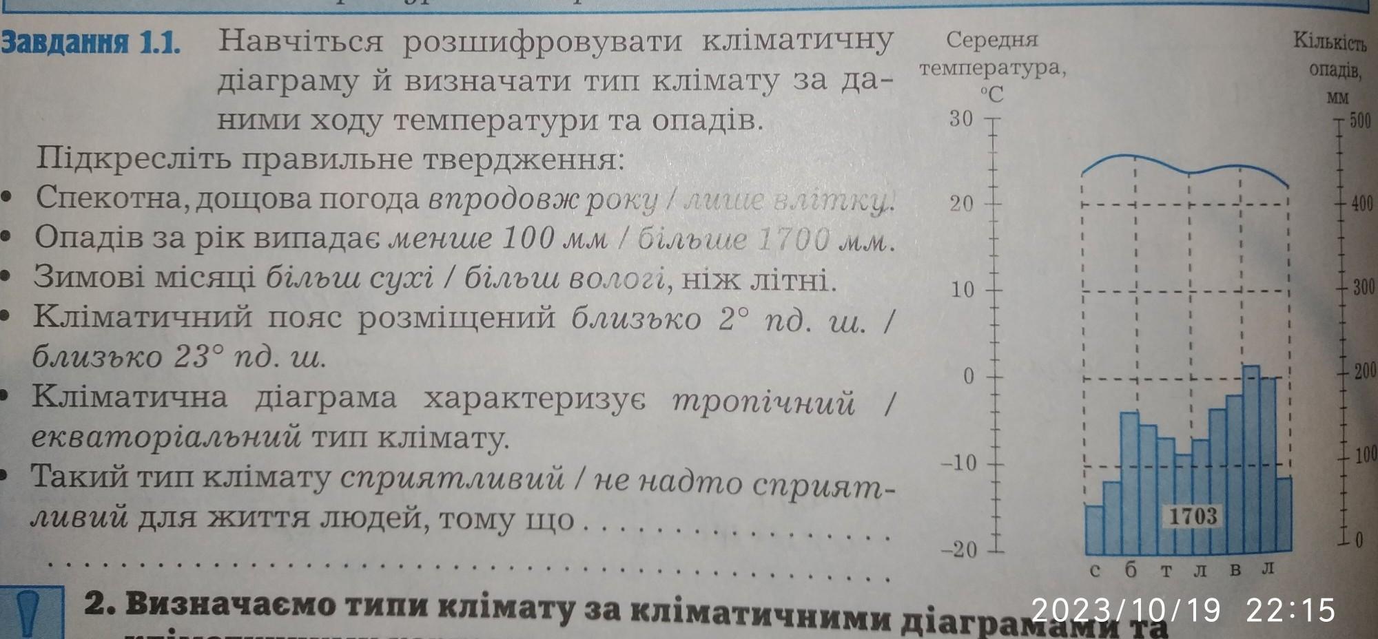 завдання 1.1. Навчіться розшифровувати кліматичну діаграму й визначати тип клімату за да- ними ходу температури та опадів. Підкресліть правильне твердження: Спекотна, дощова погода впродовж року / лише влітку. Опадів за рік випадає менше 100 мм / бiльше 1700 мм. Зимові місяці більш сухі / бiльш володі, ніж літні. Кліматичний пояс розміщений близько 2° пд. ш. / близько 23° пд. ш. Кліматична діаграма характеризує тропічний / екваторіальний тип клімату. Такий тип клімату сприятливий / не надто сприят- ливий для життя людей, тому що..