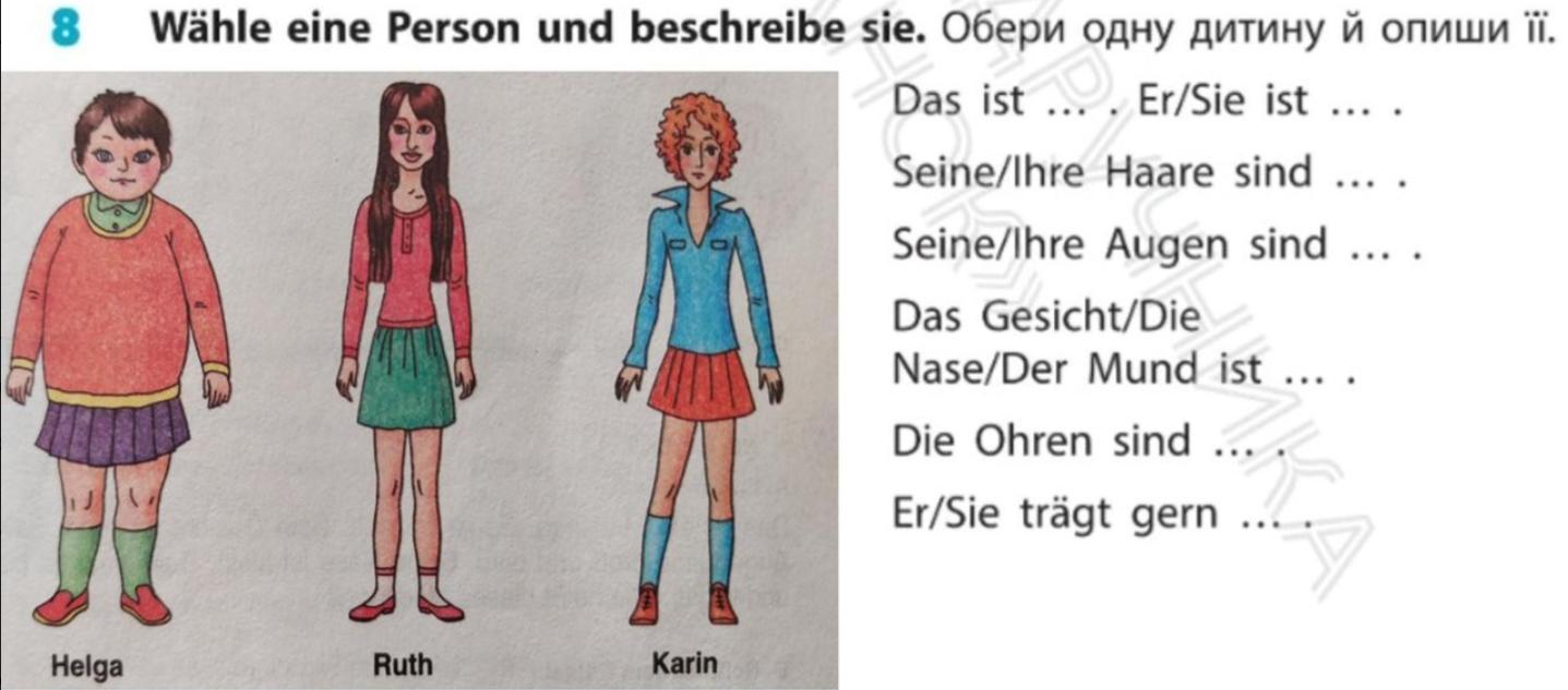 Das ist Helga. Sie ist sehr schön. Ihre Haare sind kurz und braun. Ihre Augen sind blau. Das Gesicht ist wie ein Kreis. Die Ohren sind groß. Sie trägt gern ein Kleid.